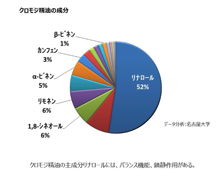 クロモジの主成分「リナロール」は、ストレスを和らげる効果や殺菌鎮静作用で知られ、古来より多くの人々に親しまれてきました。リラックス効果だけでなく、のど飴の食用にもよく使用される安心成分です、花粉症や肌荒れ、アレルギー対策、不眠や認知症への効果も期待されています。