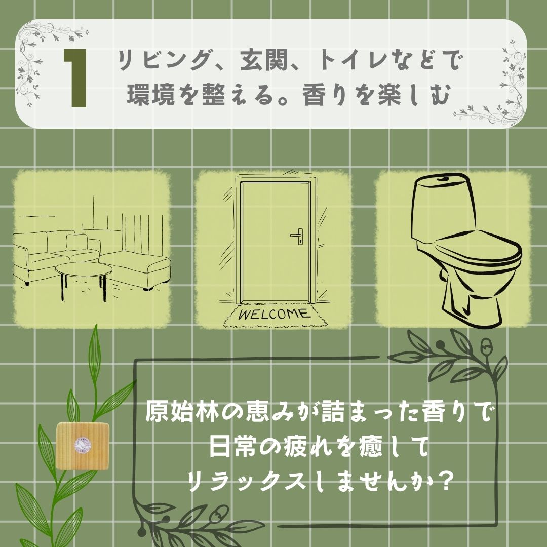 ・リビング、玄関、トイレなどで環境を整える。香りを楽しむ