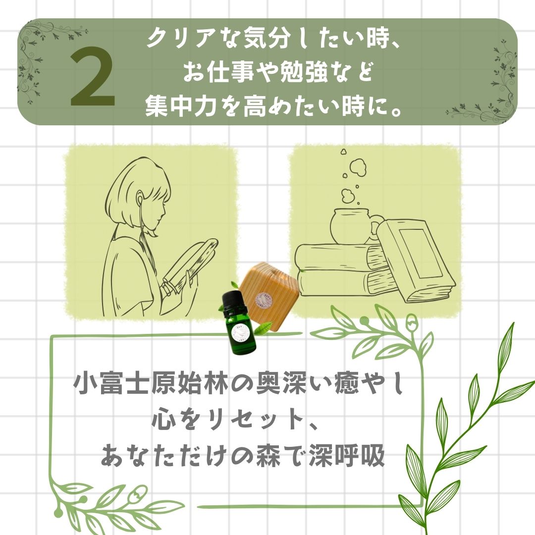 忙しい毎日に追われていませんか?この原始林ヒノキの香りをひとたび感じれば、まるで森の中にいるような安らぎが広がり、心の疲れがふっと軽くなります。特別なひとときを、ぜひご自身のためにお楽しみください。
