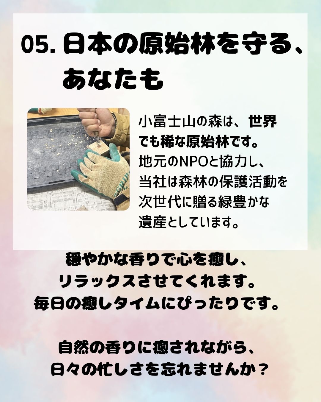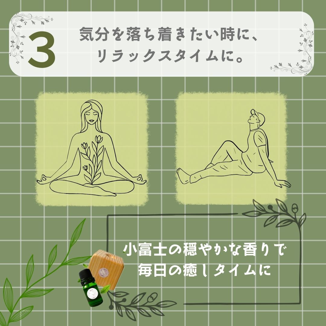 2,ヒノキディフューザーの使用原材料は、高級和タンスや日本伝統工芸品と同様素材の端材をSDGs理念で採用し、地元NPO法人の障がい者就労支援作業所の皆さまのご協力を頂き加工し、すべて手作業で一つ一つ丁寧に作り、磨き仕上げています。皆さまのご愛用により、作業所の方々の支援と小富士の原始林保護になります。心より感謝申しあげます。