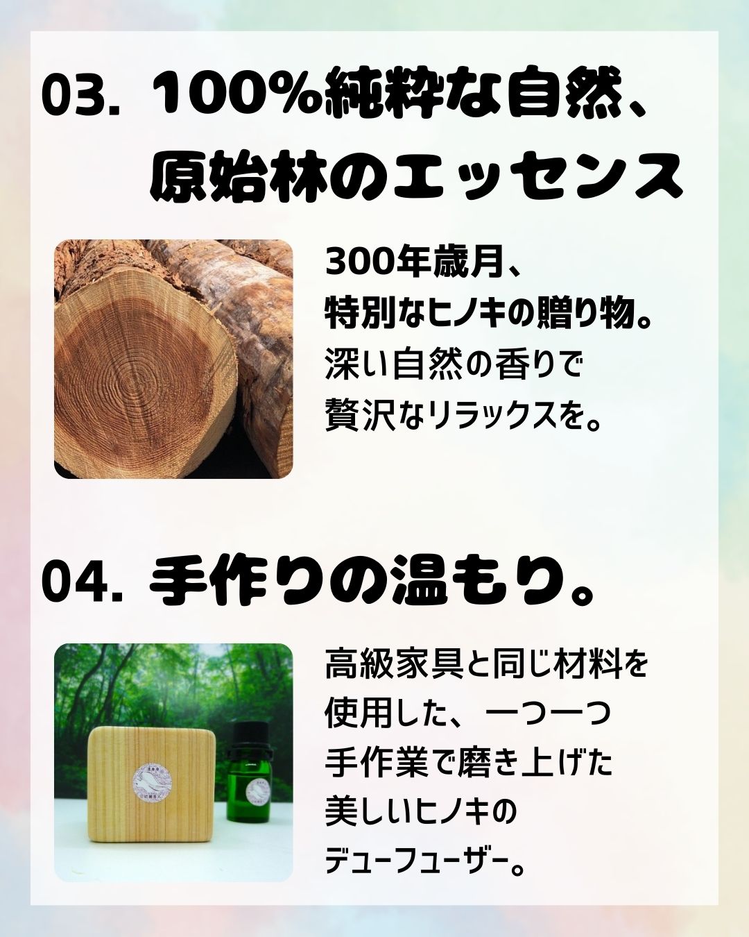 原始林で300年以上の時を経て育ったヒノキを、ブレンドなし・添加物なしでそのまま贅沢にボトルに閉じ込めました。他では手に入らない、純粋で日本らしい、繊細で雅な特別香りを体感してください。